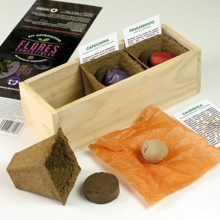 El Kit de Flores comestibles contiene todo lo necesario para el cultivo de caléndula, pensamiento y capuchina: 3 macetas de germinación 100% biodegradables, 3 pastillas de turba, 3 bombas de semillas envueltas en papel de seda y 3 fichas con los cuidados necesarios para cada planta