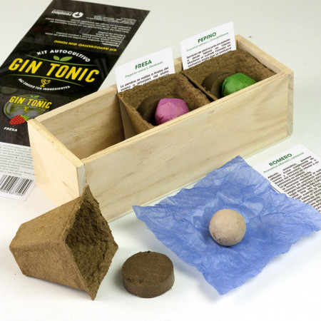El Kit Gin Tonic contiene todo lo necesario para el cultivo de romero, fresa y pepino: 3 macetas de germinación 100% biodegradables, 3 pastillas de turba, 3 bombas de semillas envueltas en papel de seda y 3 fichas con los cuidados necesarios para cada planta.