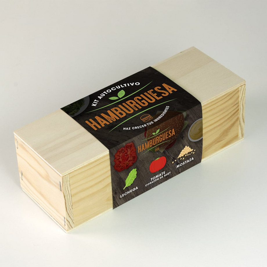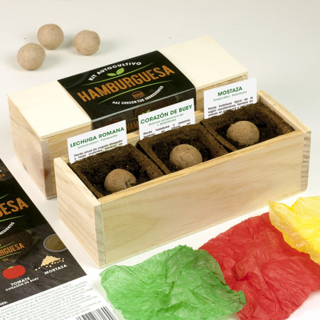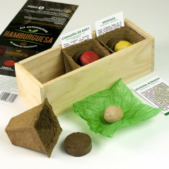 El Kit Hamburguesa contiene todo lo necesario para el cultivo de lechuga, tomate corazón de buey y mostaza: 3 macetas de germinación 100% biodegradables, 3 pastillas de turba, 3 bombas de semillas envueltas en papel de seda y 3 fichas con los cuidados necesarios para cada planta.