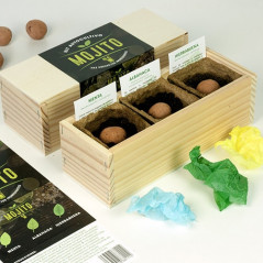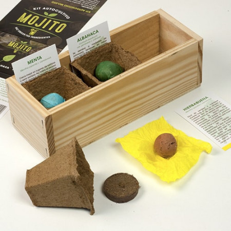 El Kit Mojito contiene: 3 macetas de germinación 100% biodegradables, 3 pastillas de turba, 3 bombas de semillas envueltas en papel de seda y 3 fichas con los cuidados necesarios para cada planta.