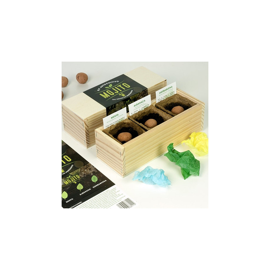 Y si eres más de ron que de ginebra, te presentamos el kit de autocultivo para mojitos. Ese sabor fresco capaz de teletransportarte a una puesta de sol en la playa o a una fiesta de verano, no se obtiene únicamente del ron, la lima y el azúcar, es gracias también a la menta, la albahaca y la hierbabuena, las podréis cultivar con éste kit.