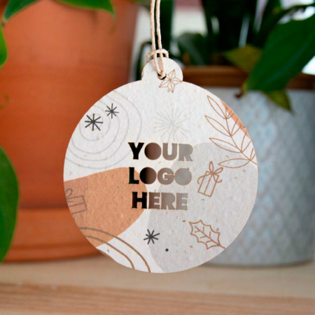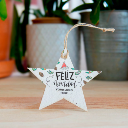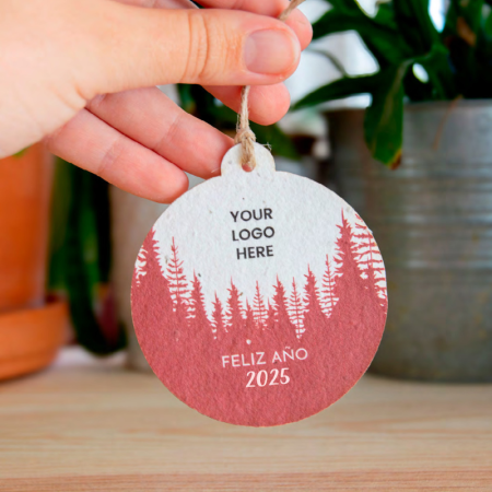 Nuestros adornos navideños pueden ser personalizados con el logo de tu empresa, creando un regalo corporativo que destaca por su originalidad y compromiso ecológico. Cada adorno está hecho de papel plantable, una innovadora mezcla de papel reciclado y semillas, que al ser plantado, germina en hermosas plantas.