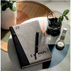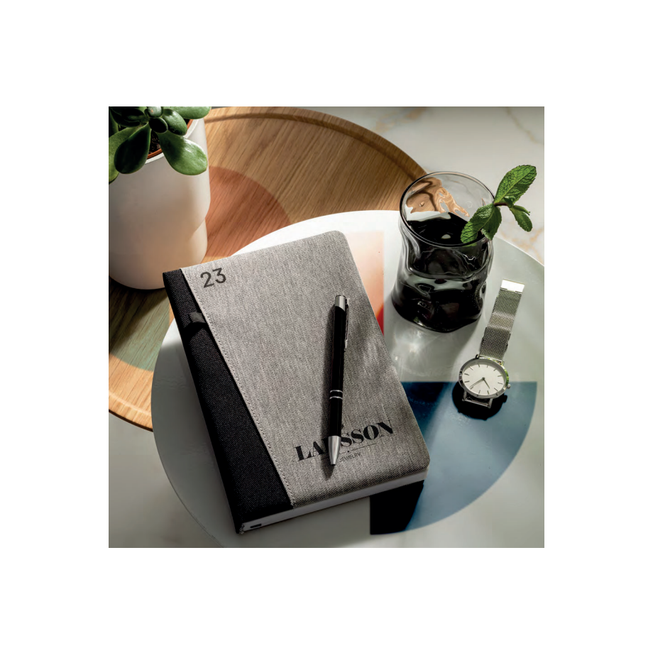 Agenda A5 en rPET. Con portalápices y marcador de cinta. Se suministra con una bolsa Non-Woven. Bolígrafo no incluido.