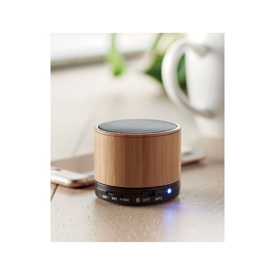 Altavoz inalámbrico con carcasa de bambú y luces indicadoras LED. Contiene una batería de litio recargable de 450 mAH. incluye un puerto para tarjeta SD y cable USB/AUX. Tiempo aproximado de reproducción de 3h.