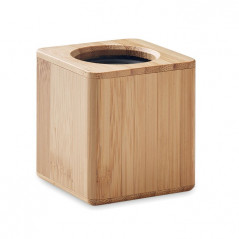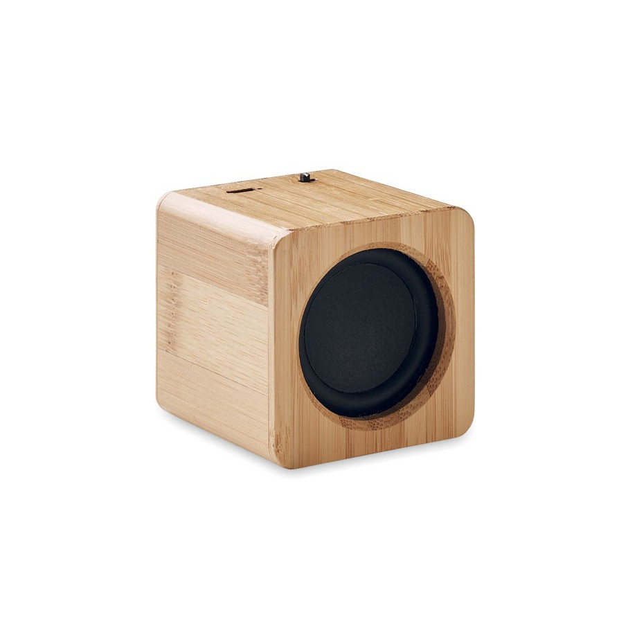 Altavoz inalámbrico con carcasa de bambú y con un indicador LED. El producto incluye una batería recargable de 500 mAh. Tiene un tiempo de reproducción de aproximadamente 4 horas..