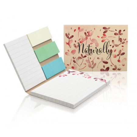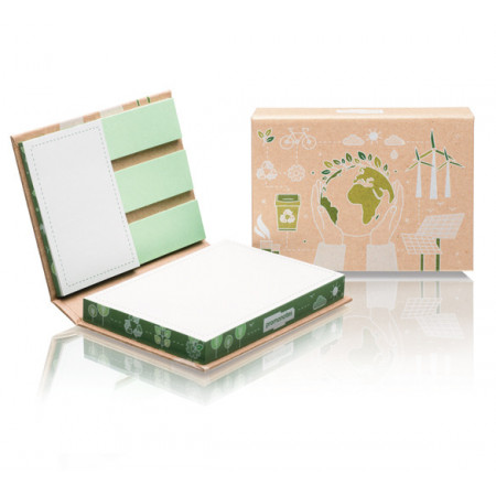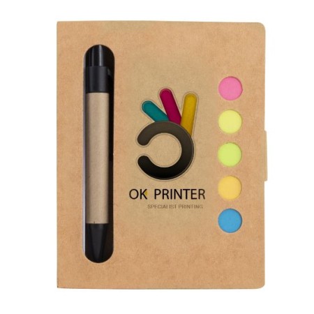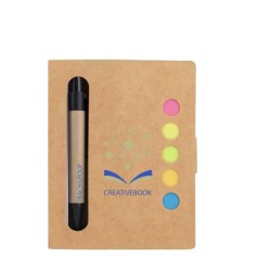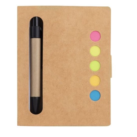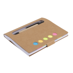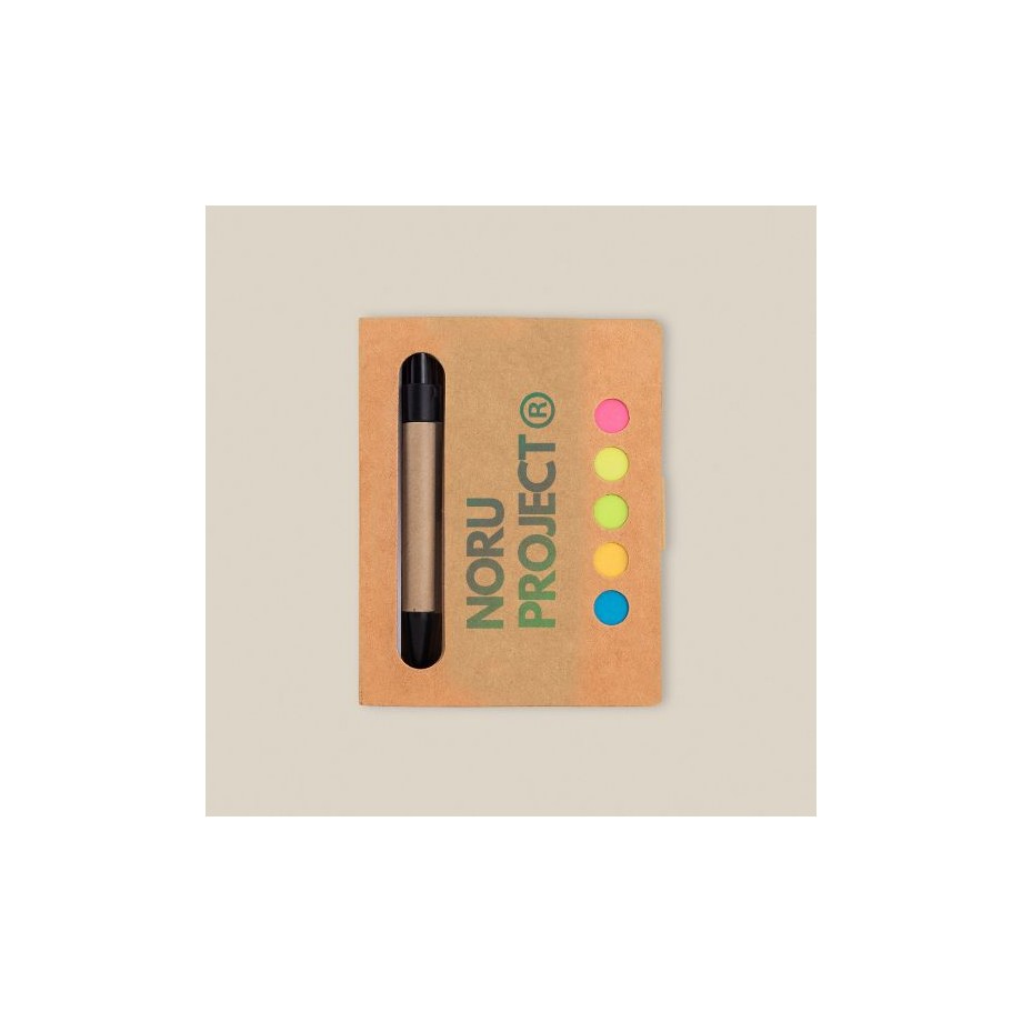 Bloc de notas fabricado en cartón reciclado con 50 páginas lisas en su interior y con notas adhesivas en cinco colores variados y un bolígrafo pequeño a juego. Ideal para merchandising y regalo publicitario.
