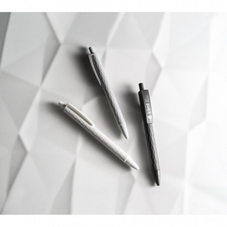 Bolígrafos en color blanco negro y gris, que junto a su textura, crean un efecto piedra, de la cual también está hecho el producto.