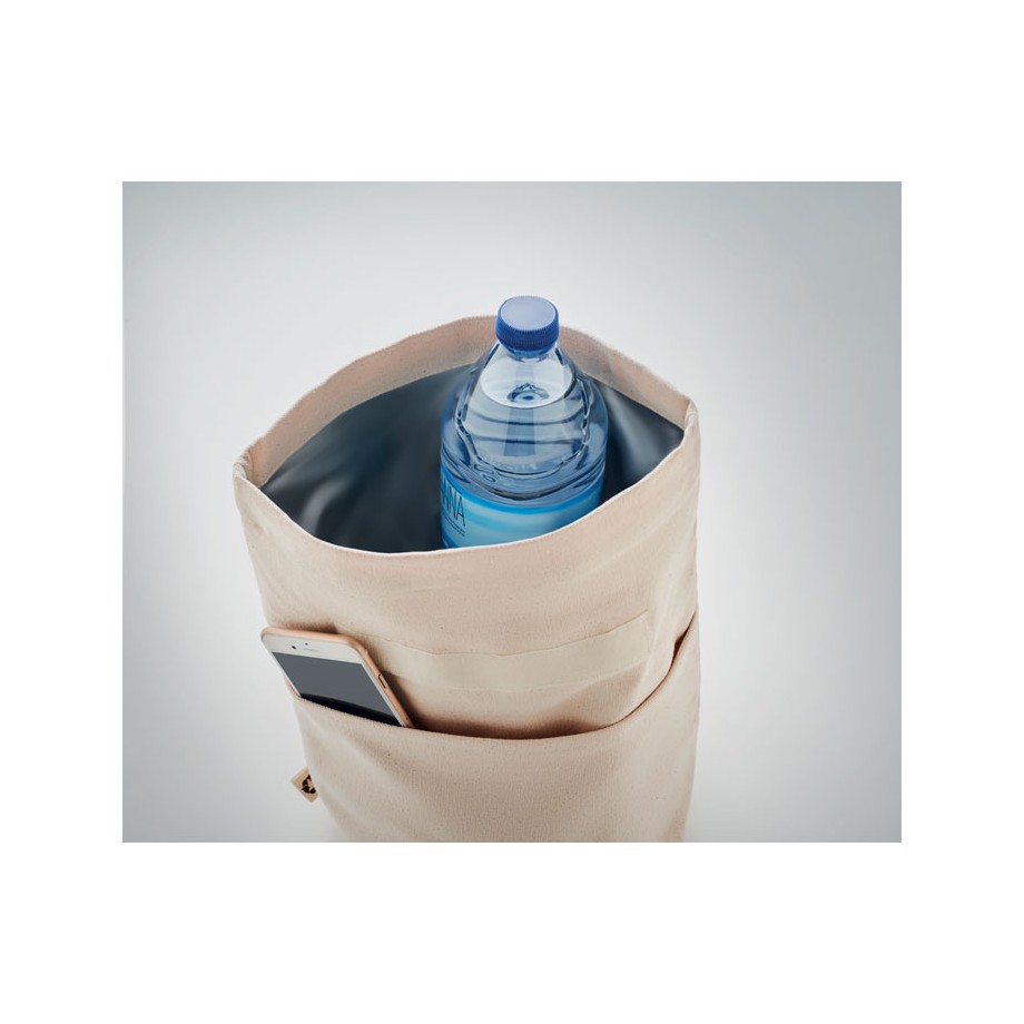 Bolsa nevera de algodón reciclado con cierre rolltop de gancho. Aislamiento de espuma de PE de 3 mm con PEVA de 12C.