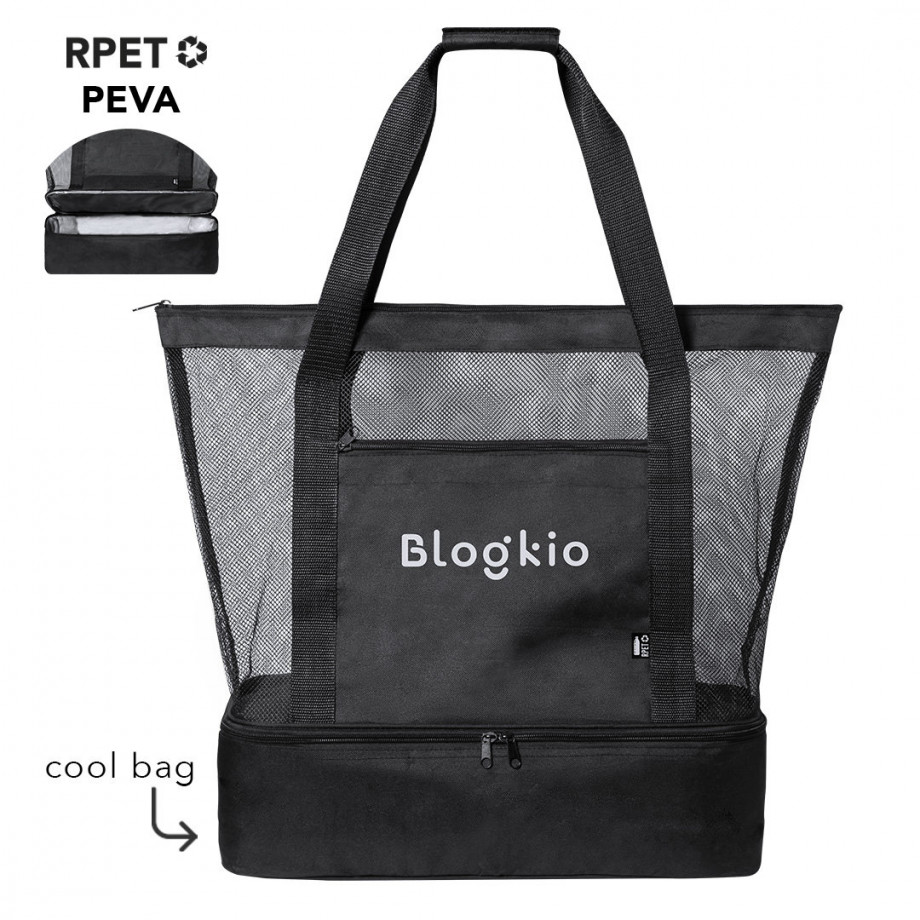 Bolsa nevera en resistente poliéster RPET 600D elaborado a partir de plástico reciclado para así fomentar la reutilización de residuos plásticos y contribuir a la sostenibilidad del planeta. Compartimento principal en redecilla tipo mesh, con cierre de cremallera. Nevera integrada en base, en resistente poliéster 600D RPET, con interior isotermo en PEVA. Asas de transporte reforzadas y amplio bolsillo frontal, con distintivo RPET en etiqueta.