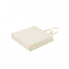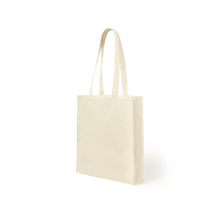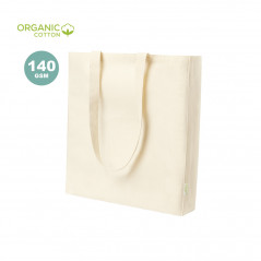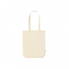 Bolsa de línea nature en algodón orgánico de 140g/m2. Asas largas en algodón orgánico, de 70 cm y reforzadas. Acabado cosido y resistencia de hasta 8kg de peso, con distintivo algodón orgánico en la etiqueta. 38 x 42 x 8 cm | 82 gr.