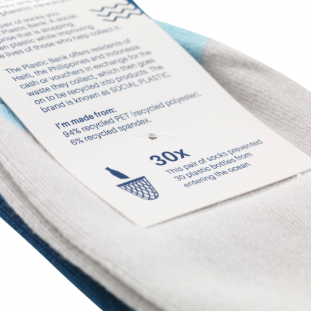 Este par de calcetines está hecho de plástico social de Plastic Bank: una empresa social que evita que el plástico ingrese al océano mientras mejora la vida de quienes ayudan a recolectarlo. The Plastic Bank ofrece a los residentes de Haití, Filipinas e Indonesia efectivo o cupones a cambio de los desechos que recolectan, que luego se reciclan en productos. La marca se conoce como SOCIAL PLASTIC.
