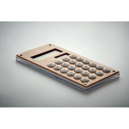 Calculadora con carcasa de bambú- 9 dígitos en ABS con batería incluida. Funciona con carga solar y pila.