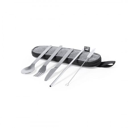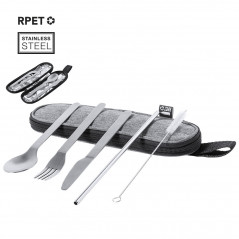 Set de cubiertos reutilizables fabricados en resistente y duradero acero inox. Incluye cuchara, cuchillo, tenedor, pajita y accesorio de limpieza. Presentados en elegante estuche individual de poliéster 300D RPET, elaborado a partir de plástico reciclado para así fomentar la reutilización de residuos plásticos y ayudar a la sostenibilidad del planeta. Estuche con cinta de transporte, cierre de cremallera y distintivo RPET en etiqueta.