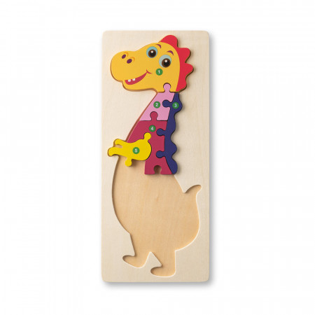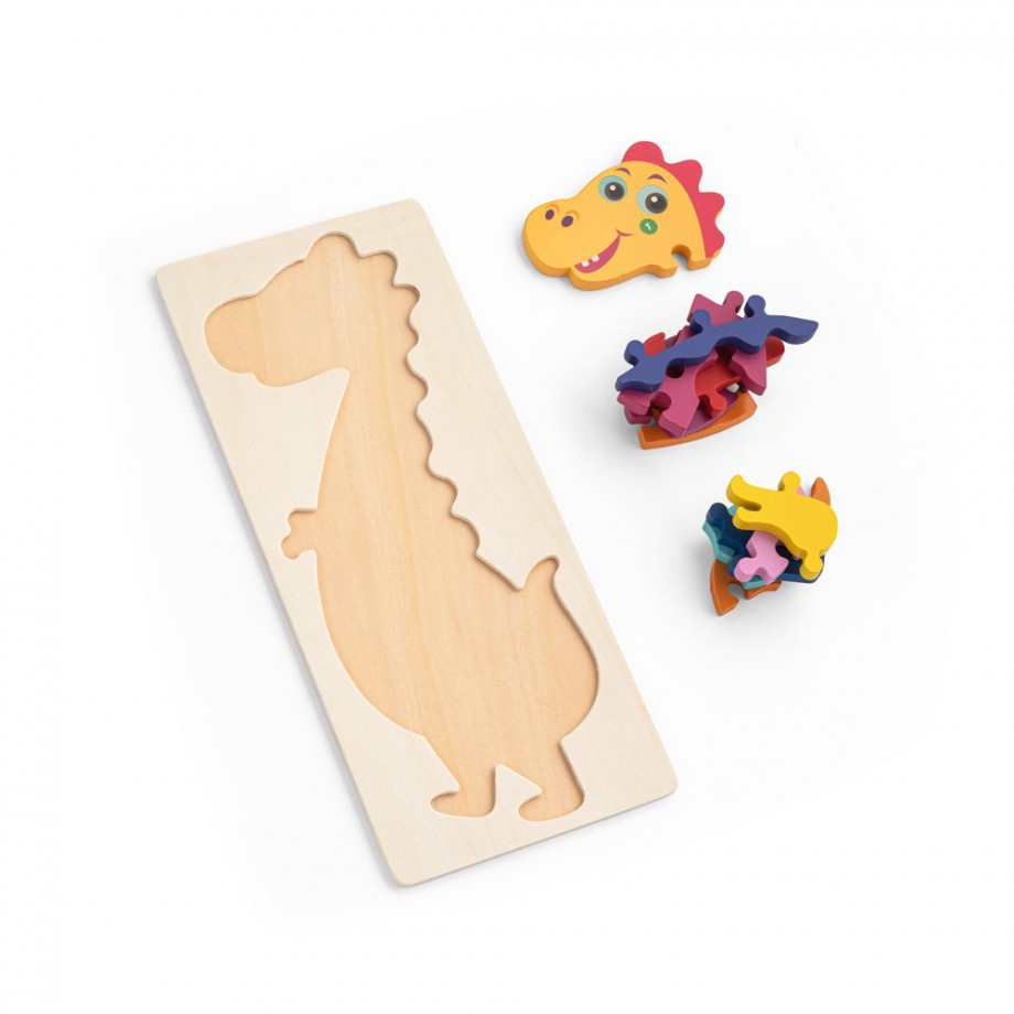 Rompecabezas con forma de dinosaurio en contrachapado de pino. La base, también en madera contrachapada, es personalizable. Se suministra en caja kraft. 128 x 298 mm