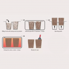 El micelio es el sistema de raíces de los hongos: la parte vegetal del hongo, que comprende varias “hifas” ramificadas y filamentosas, generalmente subterráneas. El micelio actúa como un pegamento natural que puede unir la biomasa. Un producto de micelio crece en 5 días y se seca en 2 días.