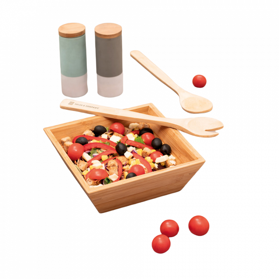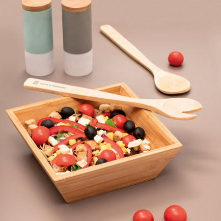 Ensaladera cuadrada de bambú. Combinable con el juego SALVY, que incluye 2 cubiertos servidores de ensalada en bambú y forman el regalo ecológico ideal.214 x 214 x 70 mm