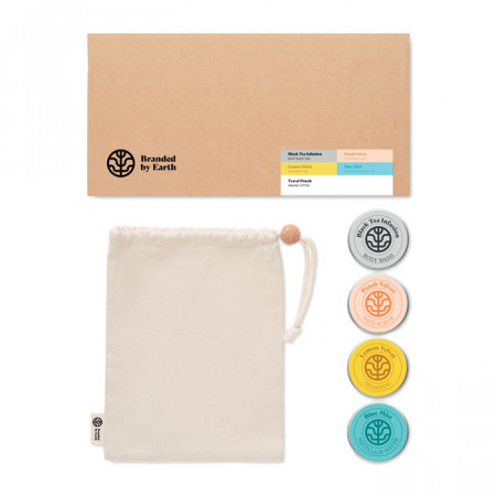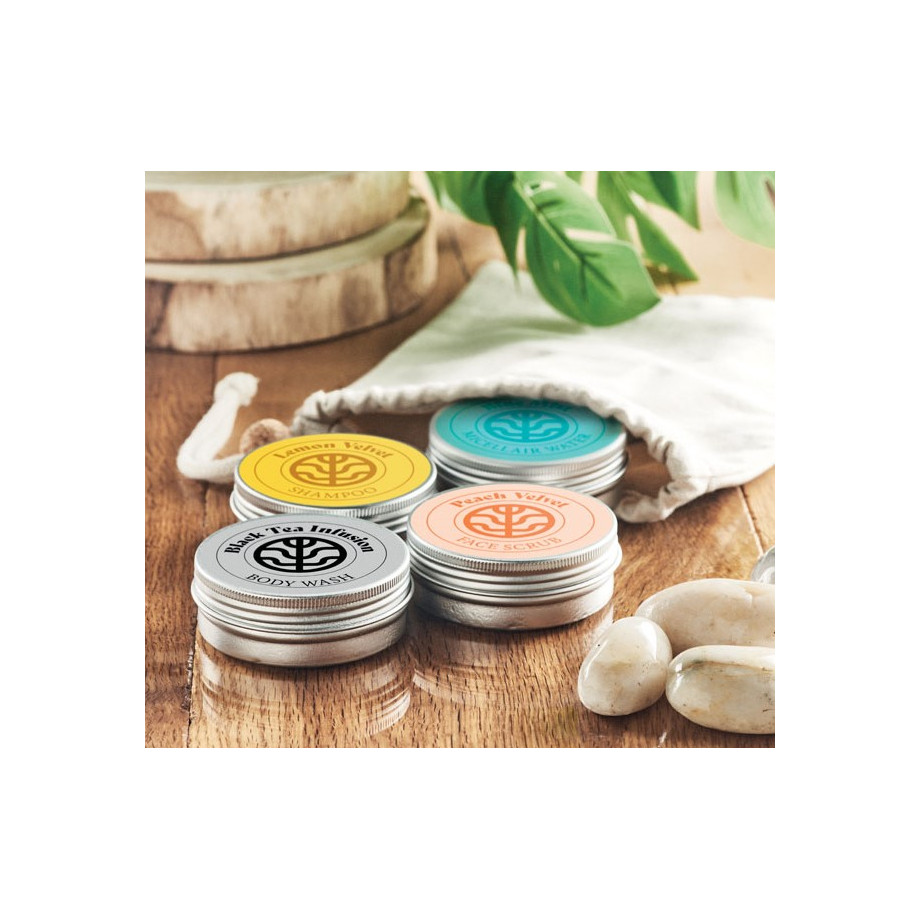 Set de regalo de viaje unisex de Branded By Earth. Incluye 50gr de lavado corporal vegano, champú, exfoliante facial, barra de agua micelar y una bolsa de viaje de algodón orgánico. Todas las piezas envasadas en lata. Presentado en caja de papel reciclado. Fabricado en la UE. Regálale a alguien especial o a ti mismo este atento regalo. Cuida tu piel y tu cabello con estos artículos de bienestar naturales. Todo lo que contiene este set está fabricado con materiales naturales y orgánicos, lo que lo convierte en una opción sostenible que tiene un impacto mínimo en el medio ambiente.