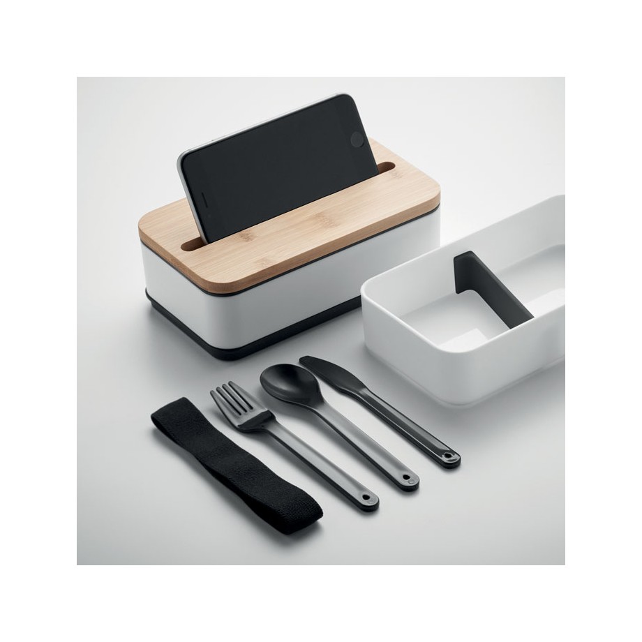 MO2088-03 - Fiambrera de dos pisos de PP con separador extraíble y 3 cubiertos con banda de poliéster acoplable y tapa de bambú. La tapa tiene función de soporte para el teléfono. Capacidad: 400 ml (2x). El bambú es un material natural, el color del articulo puede variar de unas piezas a otras.