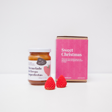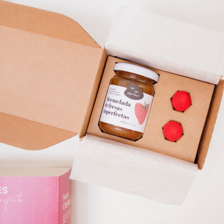 Un pack personalizable con una mermelada de fresas imperfectas (aquellas fresas que, por su forma, no entran dentro de los canales comerciales) realizada en el obrador de El Prat de Llobregat que emplea a personas en riesgo de exclusión.