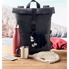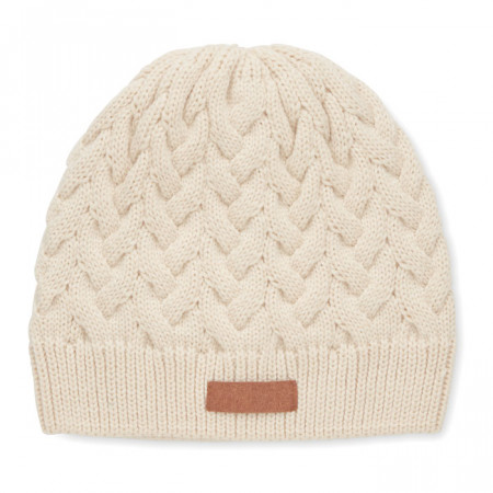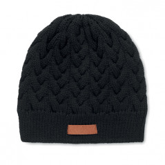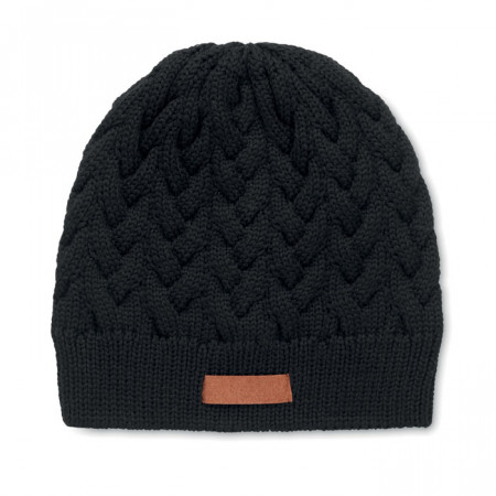 Gorro de punto en RPET con etiqueta para el área de impresión. Elegante gorro con dibujo de punto fabricado con plástico PET reciclado. El gorro tiene una etiqueta de contraste en la parte delantera. Perfecto para mantener el calor durante los días más fríos.