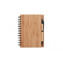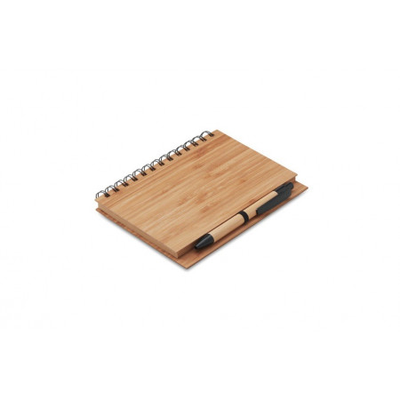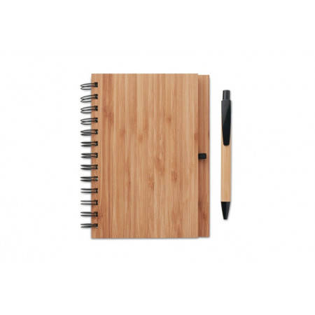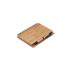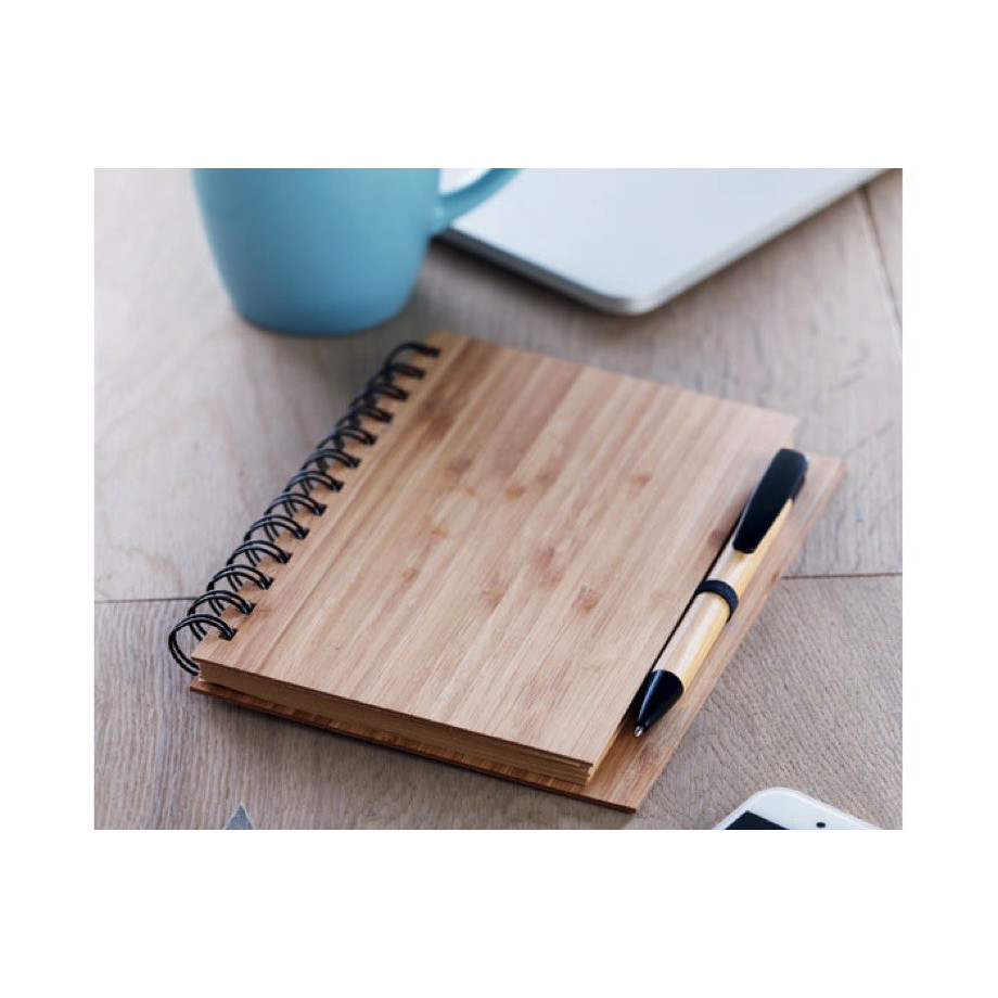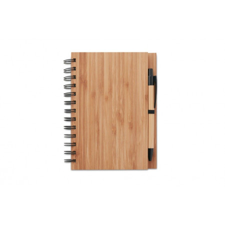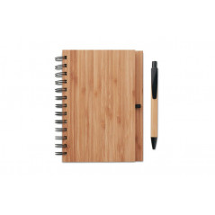 Libreta de bambú de 70 hojas de papel reciclado. Incluye un bolígrafo de bambú y clip en ABS.