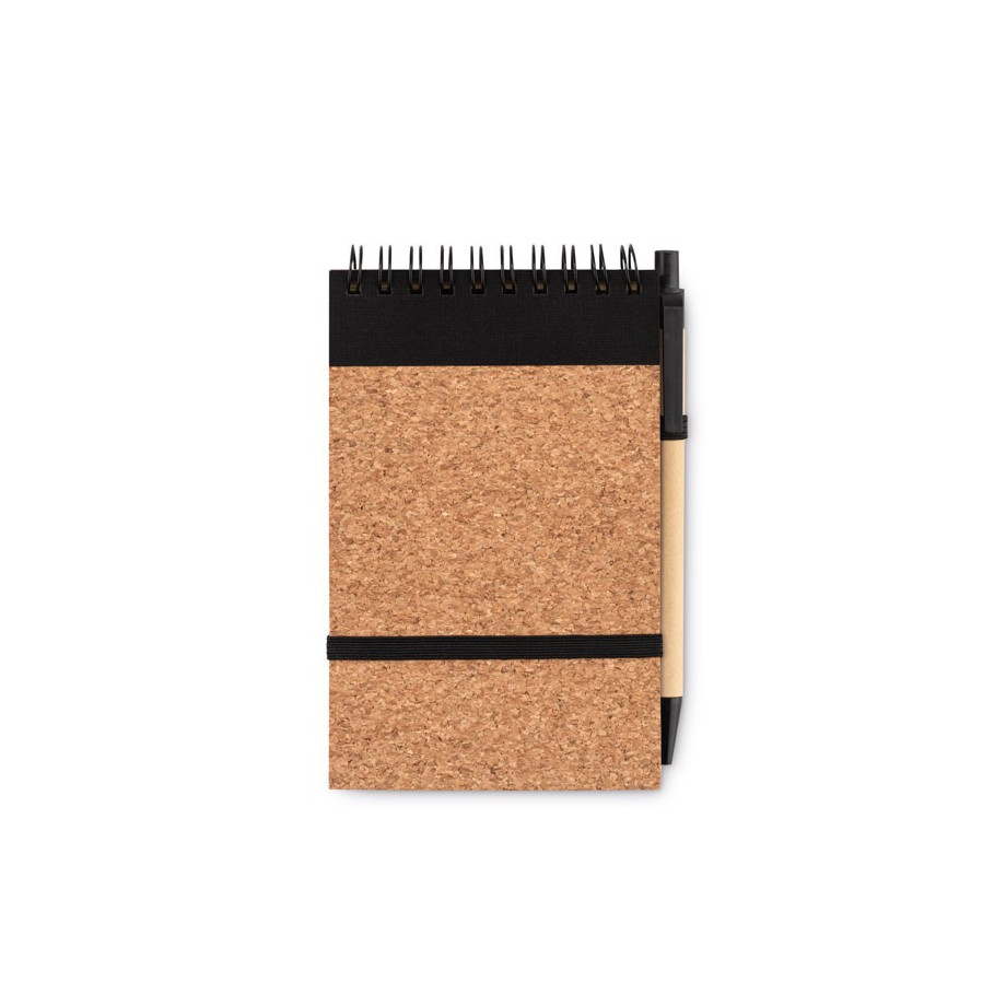 Libreta de corcho A6. Contiene 70 hojas rayadas de papel reciclado. Incluye un bolígrafo de tinta negra hecho de cartón reciclado y almidón de maíz.