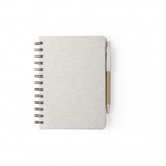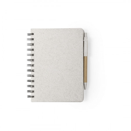 Libreta de anillas con tapas rígidas en caña de trigo, para así fomentar la utilización de materias primas naturales y reducir las emisiones contaminantes y con soporte para el bolígrafo. De 80 hojas con diseño eco y disposición a una raya. Bolígrafo de mecanismo pulsador, con cuerpo en cartón reciclado y accesorios en caña de trigo, en tinta azul.