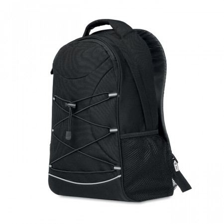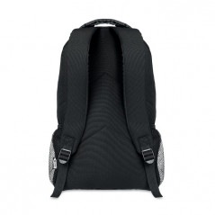 Mochila de plástico reciclado. Jaspeada y con un cordón decorativo en la parte frontal. Contiene bolsillos de malla en los costados.