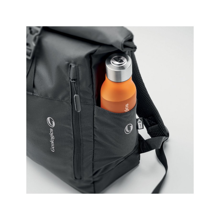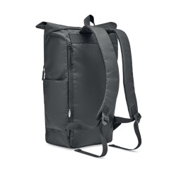 Mochila con cierre roll top para portátil de 15'' en poliéster RPET 300D. Gran bolsillo frontal con cremallera y pequeño mosquetón en el interior. El mosquetón no es apto para escalar (uso no profesional).