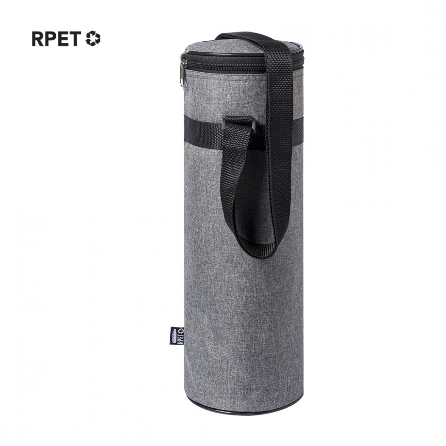 Nevera de línea nature para botellas de hasta 1,5l, fabricada en resistente poliéster 300D RPET, elaborado a partir de plástico reciclado para así fomentar la reutilización de residuos plásticos y contribuir a la sostenibilidad del planeta. Con cierre de cremallera y cómoda cinta para hombro ajustable. Interior isotermo en aluminio, con distintivo RPET en etiqueta.