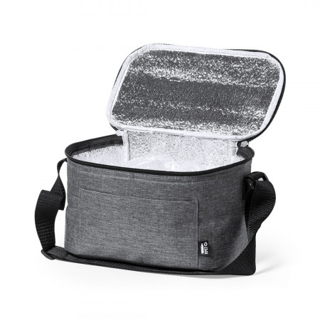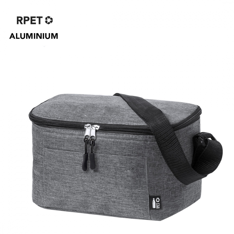 Nevera de línea nature y en resistente poliéster 600D RPET efecto melange, elaborado a partir de plástico reciclado para así fomentar la reutilización de residuos plásticos y contribuir a la sostenibilidad del planeta. Detalles en negro y base reforzada. Compartimento principal con cierre de cremallera e interior en aluminio. Incluye bolsillo exterior y cinta bandolera ajustable, con distintivo RPET en etiqueta exterior.