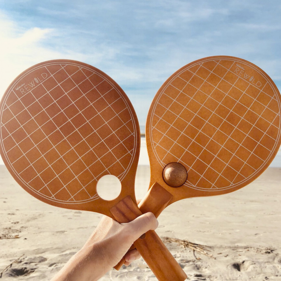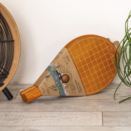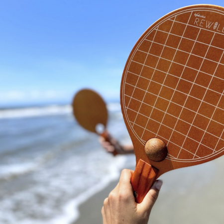 Este juego de paletas está hecho de madera de pino y bajo, y presenta una bola de corcho hecha naturalmente de la piel de los robles.