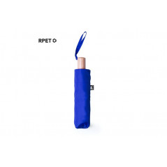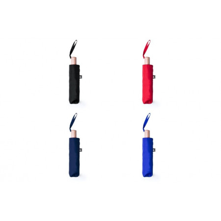 Paraguas plegable fabricado a partir de plástico reciclado. De apertura manual, con varillas metálicas anti viento y con mango de madera. Incluye una funda de transporte. Disponible en diferentes colores.