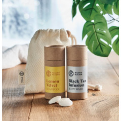 Set de regalo unisex On the Go de Branded By Earth. Incluye 24 jabones corporales veganos de 4 gramos, un champú y un paño de lavado de algodón orgánico. Todas las piezas envasadas en tubo. Presentado en caja de papel reciclado. Fabricado en la UE. Regálale a alguien especial o a ti mismo este atento regalo. Cuida tu piel y tu cabello con estos artículos de bienestar naturales. Todo lo que contiene este set está fabricado con materiales naturales y orgánicos, lo que lo convierte en una opción sostenible que tiene un impacto mínimo en el medio ambiente.