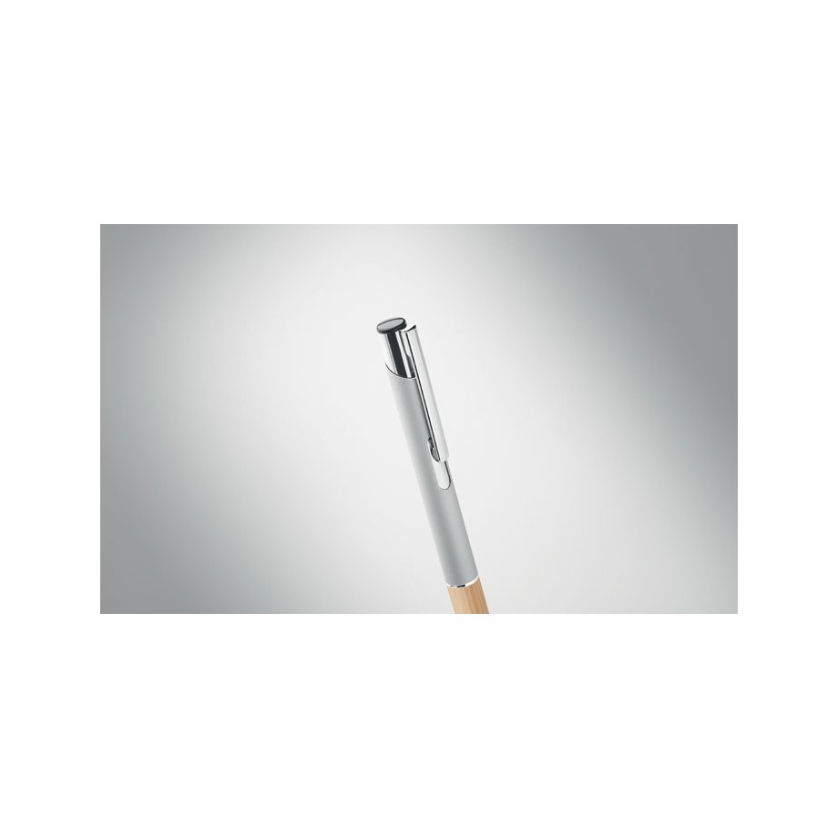 Este bolígrafo con pulsador combina elegancia y sostenibilidad gracias a su cuerpo de aluminio y su empuñadura de bambú, que proporciona un agarre cómodo y natural. Su tinta azul y diseño moderno lo convierten en un accesorio perfecto para el uso diario, mientras que sus materiales lo hacen una opción ecológica.