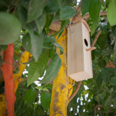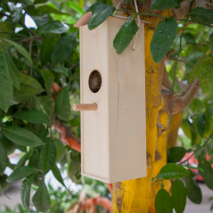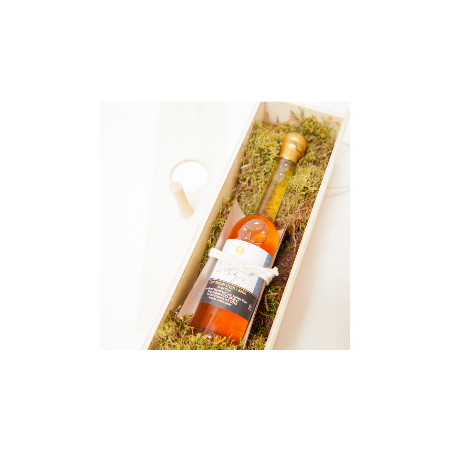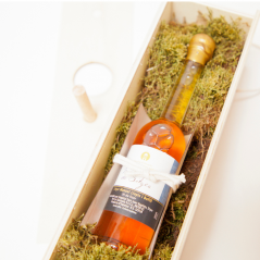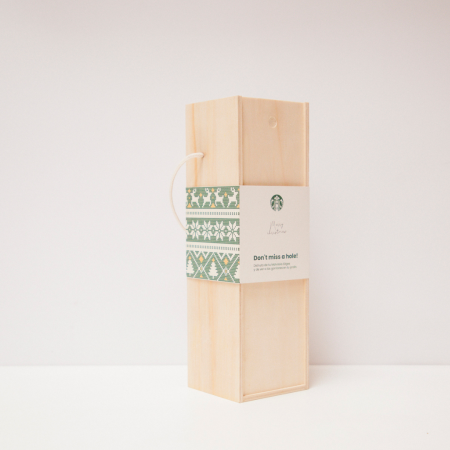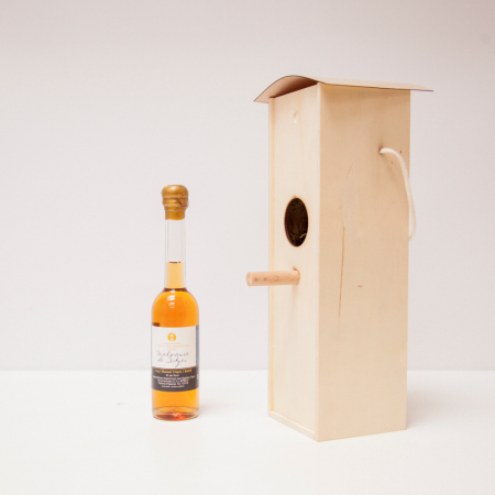Un estuche de madera que contiene una botella de vino dulce malvasía elaborado en Sitges, en la única viña dentro de la ciudad. La caja, también personalizable, se convierte en una caja-nido para gorriones, una de nuestras aves favoritas y, actualmente, en peligro de extinción.