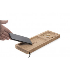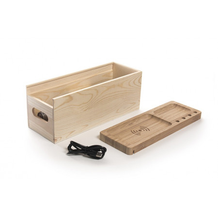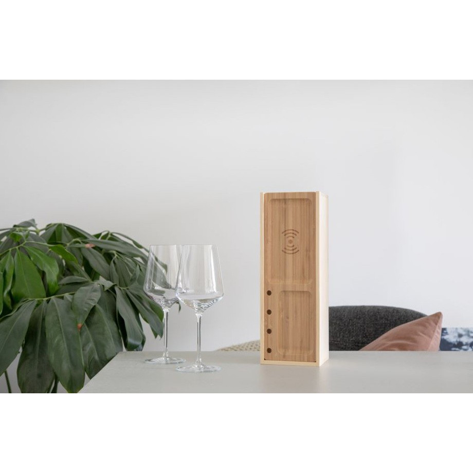 La Juice Box es una caja de regalo para botellas de vino. De bambú, su tapa incluye un cargador inalámbrico incorporado para cargar un smartphone.