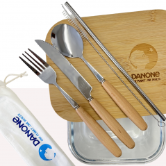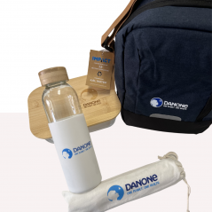 Este kit contiene una nevera personalizable en RPET, una fiambrera de bambú y cristal con el logo grabado a láser, una botella de cristal con tapa de bambú y unos cubiertos con funda de algodón personalizada.