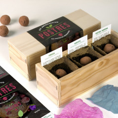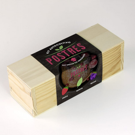 El Kit Postres contiene todo lo necesario para el cultivo de fresas, menta y moras : 3 macetas de germinación 100% biodegradables, 3 pastillas de turba, 3 bombas de semillas envueltas en papel de seda y 3 fichas con los cuidados necesarios para cada planta.